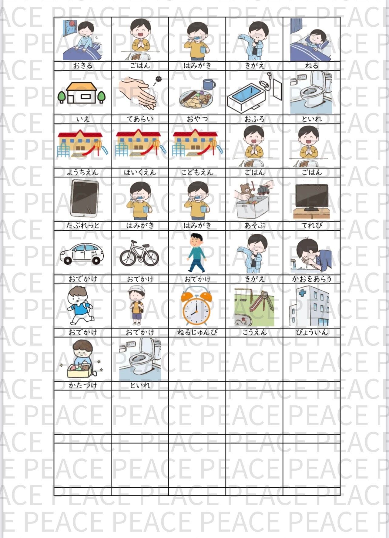 ・ダウンロードした画像を印刷し、ハサミで切り、ラミネートしてお使いください。マジックテープやマグネット等をつけて、台紙に付けても使いやすいです。